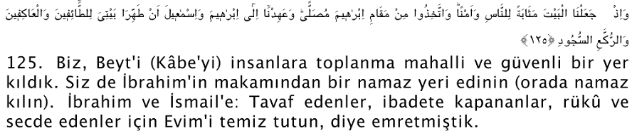 Bismillâhirrahmânirrahîm 125. Ve iz cealnel beyte mesabetel lin nasi ve emna vettehızu mim mekami ibrahıme müsalla ve ahidna ila ibrahıme ve ismaıyle en tahhira veytiye lit taifıne vel akifıne ver rukkeıs sücud